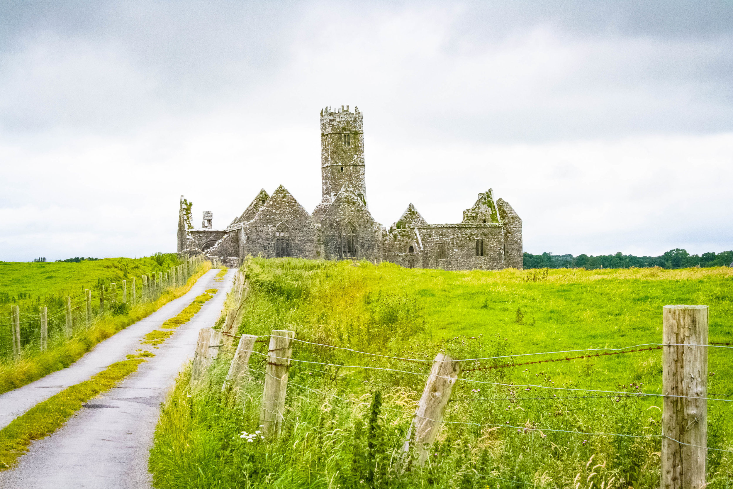 As we drove out, we stopped at the end of the long dirt pathway that led us up to Ross Errilly. The view, even from so far away, is intimidatingly haunting with its shell of triangular walls plastered against the sky, and skeletal bell tower reaching up into the clouds.